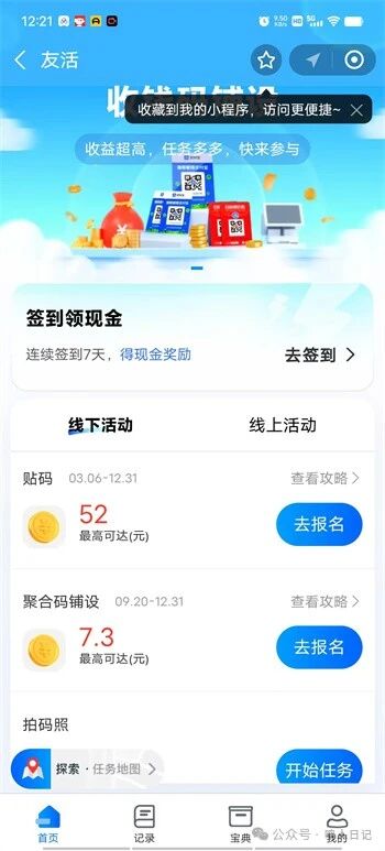 大家在自己的Zfb上面搜索:友活来了,然后就可以按照自己喜欢的方式去赚钱了,比如扫街模式,比如有,贴码任务,或者聚合码铺设任务,不会做的话,一般官方都有教程!